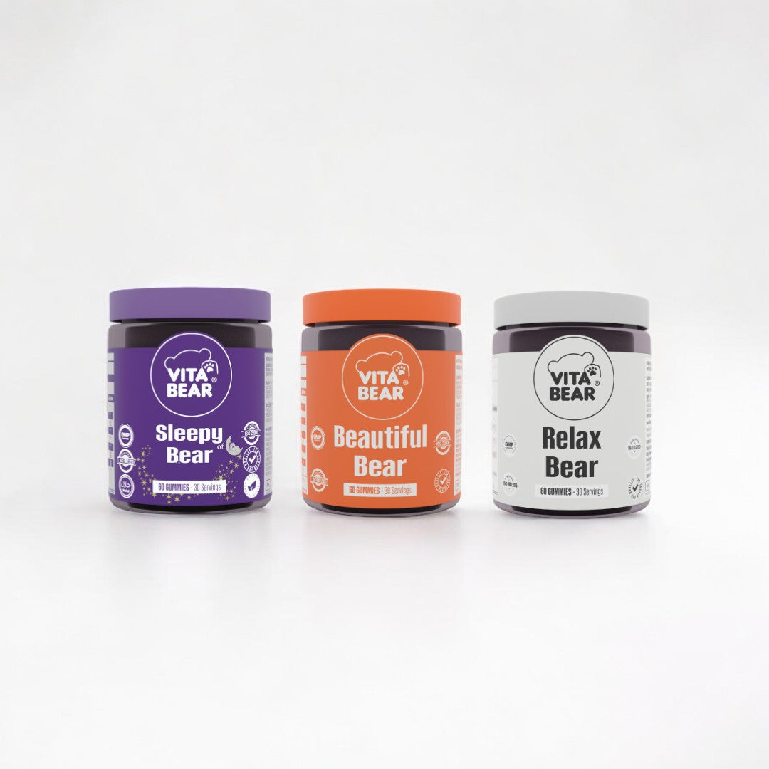 Beautiful Bear, Relax Bear y Sleepy Bear trabajan en armonía para reducir el estrés, mejorar el sueño y mejorar tu piel.